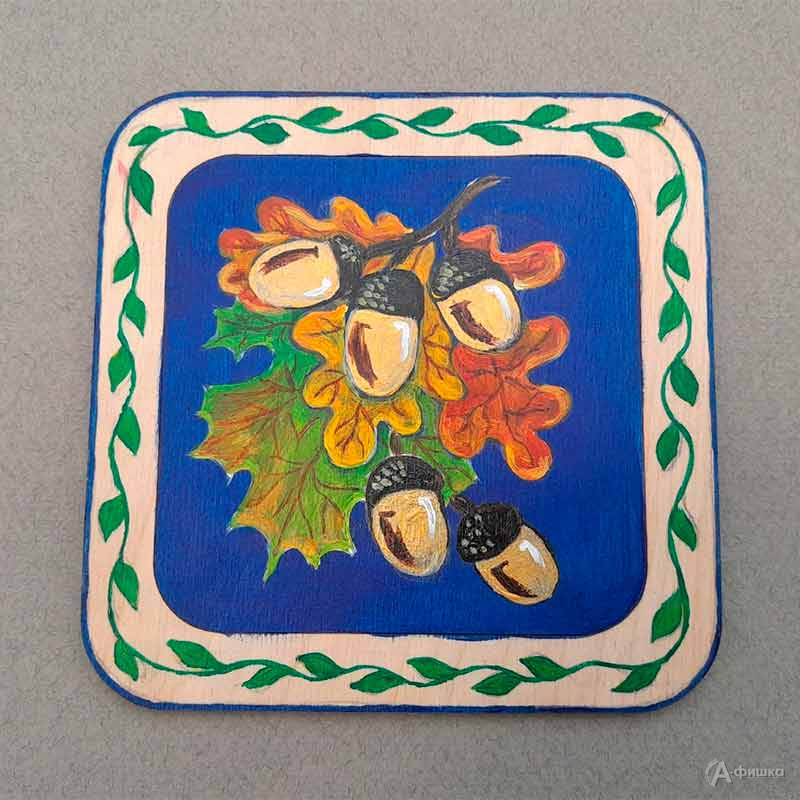 В ходе занятия участники распишут панно с изображением ветви дуба с желудями. Синий фон станет прекрасным дополнением к работе, а яркие блёстки украсят роспись деревянного панно.