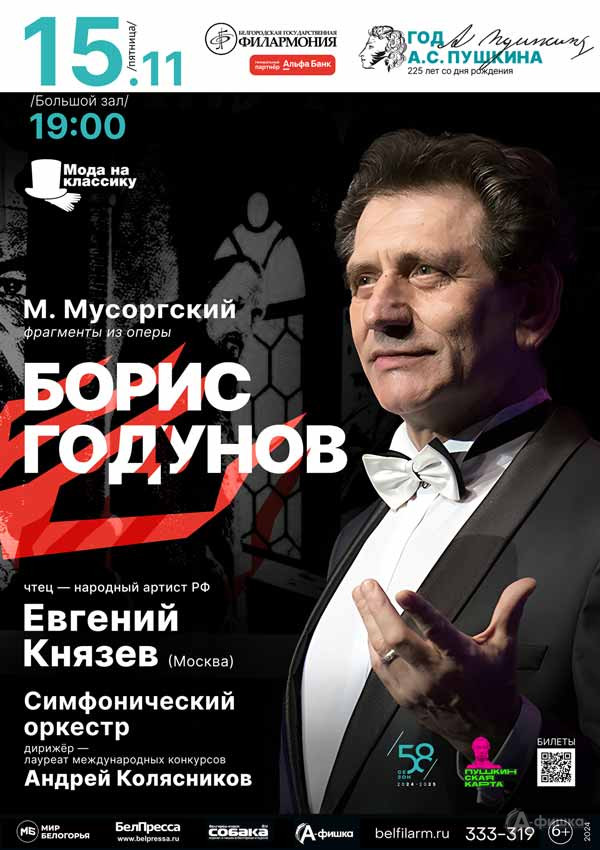 15 ноября 2024 года в Белгородской государственной филармонии в концерте «Год А. С. Пушкина. Борис Годунов» в качестве чтеца выступает народный артист РФ Евгений Князев (Москва).
