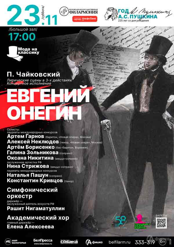 23 ноября 2024 года Симфонический оркестр и Академический хор Белгородской государственной филармонии в концерте «Год А. С. Пушкина. Евгений Онегин» представят оперу П. И. Чайковского «Евгений Онегин» в концертом исполнении.
