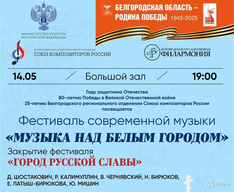 14 мая 2025 года Белгородская государственная филармония приглашает на концерт «Город русской славы», завершающий Фестиваль современной музыки «Музыка над Белым городом».