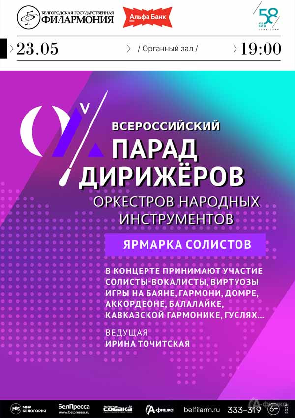 23 мая 2025 года Белгородская государственная филармония приглашает на «Ярмарку солистов» в рамках Всероссийского парада дирижёров оркестров народных инструментов.