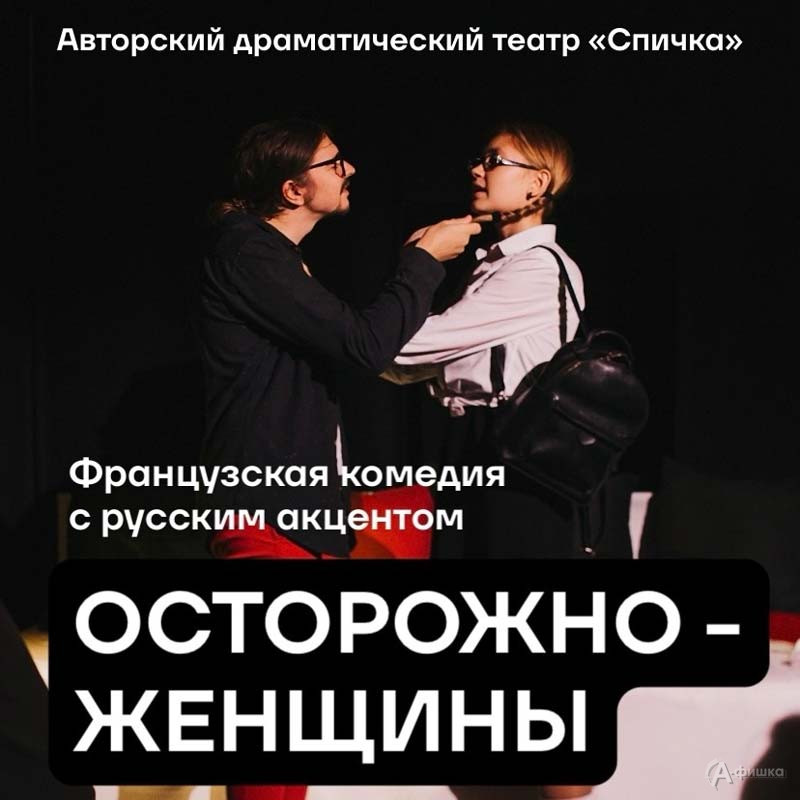 Белгородский авторский драматический театр «Спичка» приглашает на спектакль «Осторожно — женщины!» в постановке режиссёра Оксаны Половинкиной по пьесе белорусского киносценариста, режиссёра и драматурга Андрея Курейчика.
