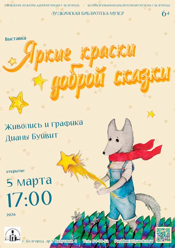 С 5 марта 2026 года в Пушкинской библиотеке-музее работает первая персональная выставка графики и живописи Дианы Буйвит «Яркие краски доброй сказки».