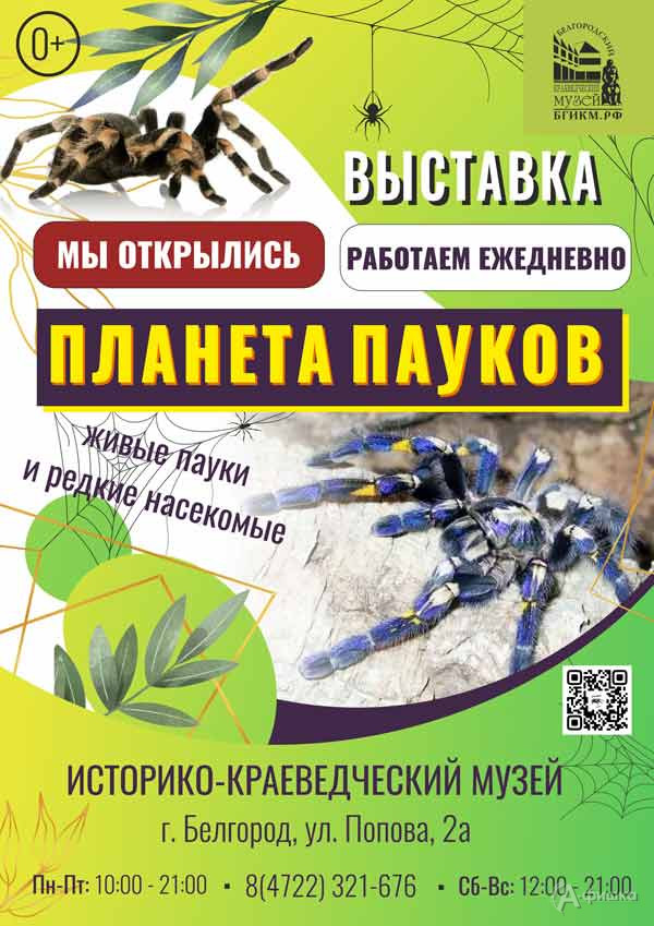 С 20 марта 2026 года в Белгородском государственном историко-краеведческом музее работает выставка «Планета пауков», на которой представлены живые членистоногие хищники.
