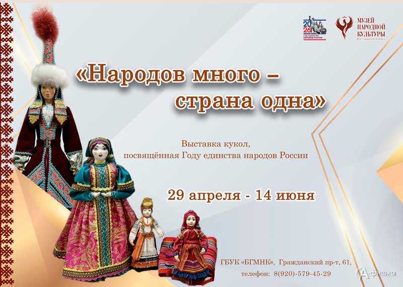 С 29 апреля 2026 года в Белгородском государственном музе народной культуры работает выставка «Народов много — страна одна», посвященная Году единства народов России.