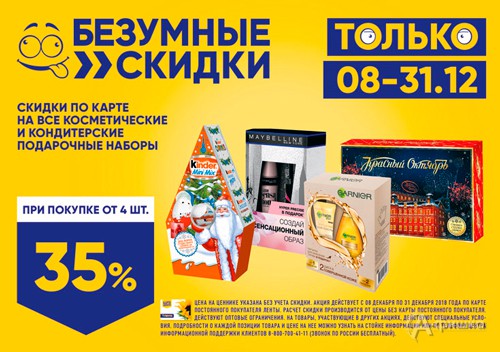 «Безумные скидки» в гипермаркетах «Лента» в Белгороде продолжаются – до 31 декабря 2018 г. скидка 35% на все косметические и кондитерские подарочные наборы по карте «Лента» при покупке от 4 шт.!