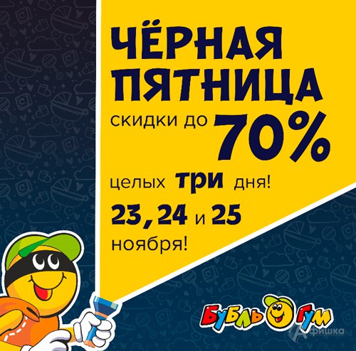 Целых 3 дня, с 23 по 25 ноября 2018 г., в гипермаркетах детских товаров «Бубль Гум» проходит Чёрная пятница – жаркие скидки до 70% на выделенный ассортимент детских товаров в рамках всемирного дня распродаж!