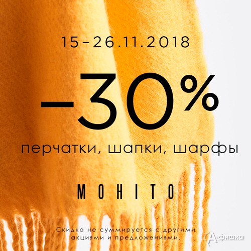 В магазине «Mohito» до 26 ноября 2018 г. действует акция – скидка 30% на зимние аксессуары! Участвуют перчатки, шапки, шарфы!