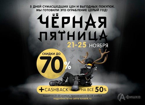 Чёрная пятница в детских магазинах «Кораблик» – 5 дней сумасшедших цен и выгодных покупок! С 21 по 25 ноября 2018 г. скидки до 70% и кэшбэк 50% на всё!