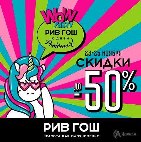 Магазин парфюмерии и косметики «Рив Гош» празднует День рождения! С 23 по 25 ноября 2018 г. скидки до 50%, чудо-маска красоты и сертификат на 600 руб. в подарок при покупке от 2500 руб.!