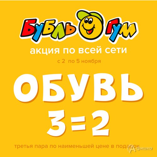 Со 2 по 5 ноября 2018 г. в гипермаркетах детских товаров «Бубль Гум» проходит акция «3=2» на всю коллекцию детской обуви – при покупке 2-х пар третья в подарок!