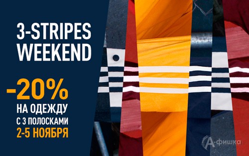 Акция «3-Stripes Weekend» в спортивных магазинах «Adidas» в Белгороде – со 2 по 5 ноября 2018 г. скидка 20% на одежду с тремя полосками + скидка по вашей карте Sport Universe!