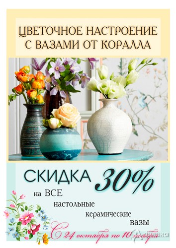 До 10 ноября 2018 г. в магазинах подарков и товаров для дома «Коралл» в Белгороде проходит акция «Цветочное настроение» – скидка 30% на все настольные керамические вазы!
