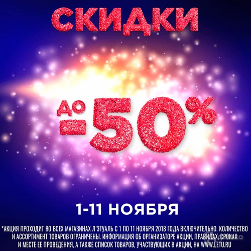 Только с 1 по 11 ноября 2018 г. в сети магазинов парфюмерии и косметики «Л’Этуаль» скидки до 50% на выборочный ассортимент товаров!