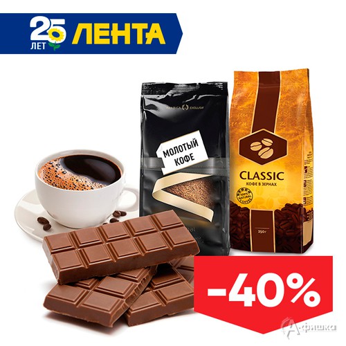 Только 30 октября 2018 г. в гипермаркетах «Лента» в Белгороде пройдет акция – скидка 40% на кофе молотый, зерновой, а также шоколадные плитки по карте «Лента»!