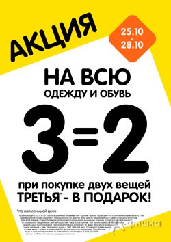 С 25 по 28 октября 2018 г. в магазинах «Детский мир» проходит акция «3=2» на всю одежду и обувь – при покупке двух вещей третья в подарок!