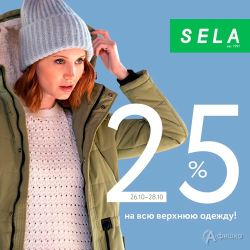 В магазине одежды «Sela» в Белгороде специальное предложение – с 26 по 28 октября 2018 г. на всю верхнюю одежду скидка 25%!