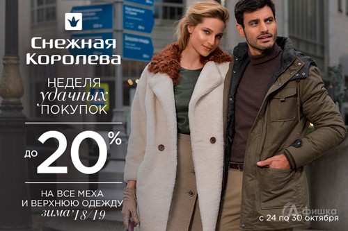 С 24 по 30 октября 2018 г. в магазине «Снежная Королева» в Белгороде «Неделя удачных покупок» – скидки до 20% на все меха и верхнюю одежду из коллекции «Зима 2018/19»!