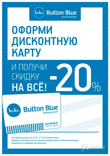 До 31 октября 2018 г. в фирменном магазине одежды для детей «Button Blue» в Белгороде проходят клиенские дни – всем владельцам дисконтных карт скидка 20% на всё!