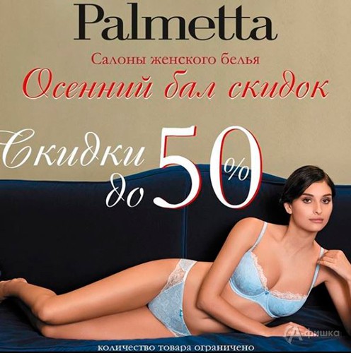 В фирменных салонах женского белья «Palmetta» с 26 октября по 11 ноября 2018 г. проходит ежегодный «Осенний бал скидок» – на модные коллекции белья скидки до 50%!