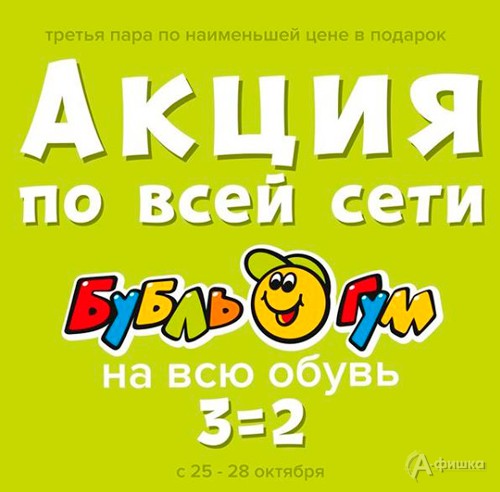 С 25 по 28 октября 2018 г. в гипермаркетах детских товаров «Бубль Гум» проходит акция «3=2» на всю коллекцию детской обуви – при покупке 2-х пар третья в подарок!