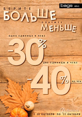 До 31 октября 2018 г. в магазинах сумок и аксессуаров «Bags etc» в Белгороде проходит акция «Бери больше – плати меньше»! При покупке одного товара скидка 30%, от двух товаров – скидка 40% на весь чек!