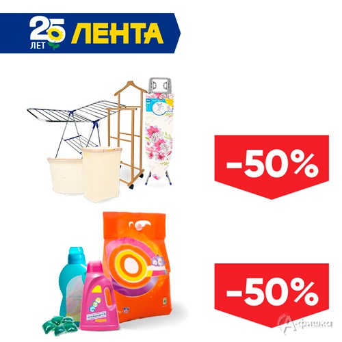 Только 27 октября 2018 г. в гипермаркетах «Лента» в Белгороде пройдет акция – скидка 50% на стиральные порошки, гели, капсулы для стирки, кондиционеры, а также гладильные доски, вешалки и сушилки по карте «Лента»!