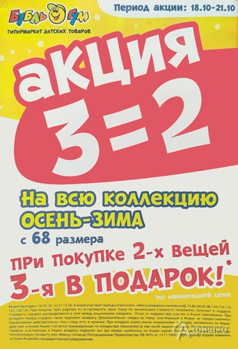 С 18 по 21 октября 2018 г. в гипермаркетах детских товаров «Бубль Гум» проходит акция «3=2» на детскую одежду сезона «Осень-Зима» – при покупке 2-х вещей третья в подарок!