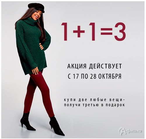 В фирменных магазинах одежды «Oodji» в Белгороде до 28 октября 2018 г. проходит акция «1+1=3» – купите две любые вещи и получите третью в подарок!