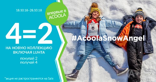В магазинах детской одежды «Acoola Kids» в Белгороде с 18 по 28 октября 2018 г. проходит акция «4=2» на новую коллекцию – покупайте две вещи и ещё две получайте в подарок!
