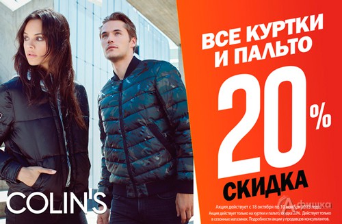 В магазинах одежды модного бренда «Colin’s» акция – до 10 ноября 2018 г. на все куртки и пальто скидка 20%! Участвует женская и мужская коллекции.