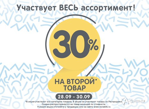 С 28 по 30 сентября 2018 г. в детских магазинах «Кораблик» выгодная акция – на второй товар скидка 30%! Участвует весь ассортимент!