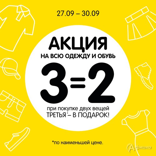С 27 по 30 сентября 2018 г. в магазинах «Детский мир» проходит акция «3=2» на всю одежду и обувь – при покупке двух вещей третья в подарок!