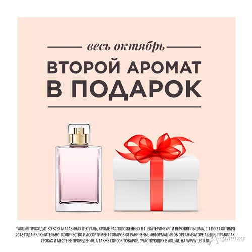Только в октябре 2018 г. в сети магазинов парфюмерии и косметики «Л’Этуаль» проходит акция «Второй аромат в подарок»! При покупке одного товара из категории «Парфюмерия», второй в подарок!