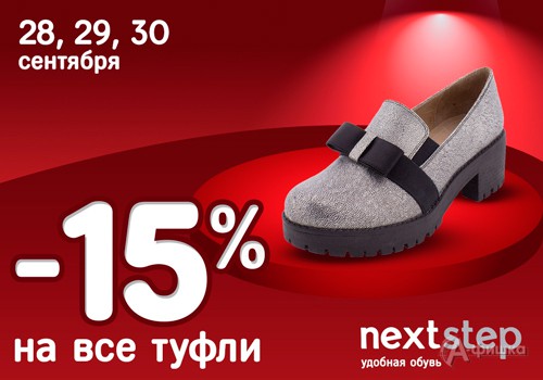 В салоне обуви и аксессуаров «Next Step» в Белгороде проходит акция – с 28 по 30 сентября 2018 г. скидка 15% на все туфли из новой коллекции!