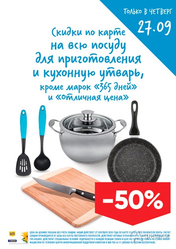 Только 27 сентября 2018 г. в гипермаркетах «Лента» в Белгороде акция – скидка 50% на всю посуду для приготовления и кухонную утварь; скидка 30% на все шоколадные яйца (при покупке от 2-х штук) по карте «Лента»!