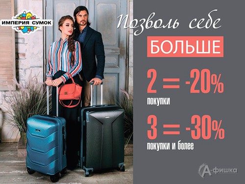 С 1 по 31 октября 2018 г. в магазинах «Империя сумок» в Белгороде проходит акция «Позволь себе больше!» – совершите 2 покупки и получите скидку 20% на чек; 3 покупки и более – скидку 30% на чек!