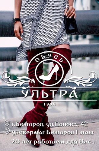 В честь 20-летия обувных магазинов «Ультра» в Белгороде здесь проходит акция – с 10 по 13 сентября 2018 г. вас ждёт скидка 20% на новую коллекцию! Продолжается сезонная распродажа со скидками до 50%!