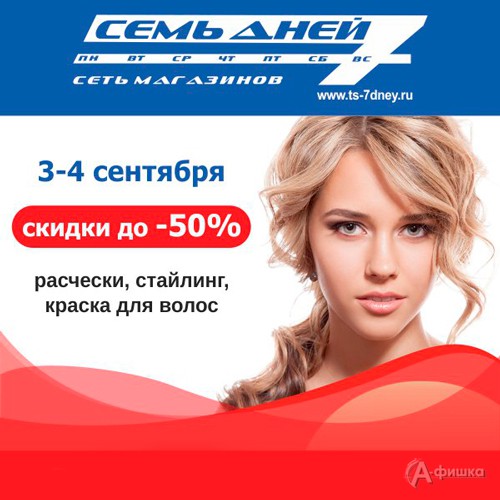 3 и 4 сентября 2018 г. в сети магазинов парфюмерии, косметики и бытовой химии «Семь дней» в Белгороде проходит акция – скидки до 50% на расчёски, стайлинг, краску для волос!