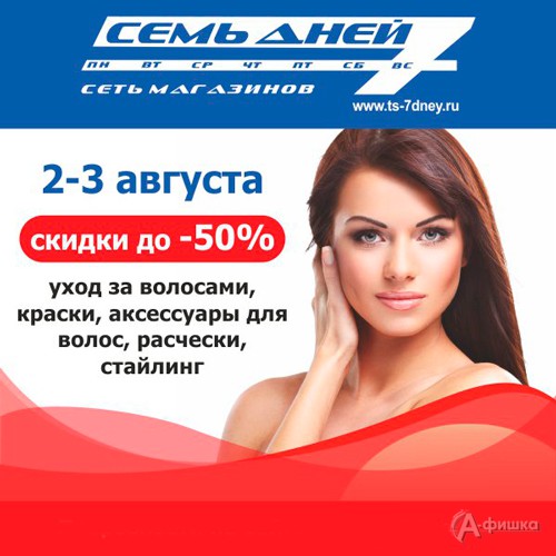 2 и 3 августа 2018 г. в сети магазинов парфюмерии, косметики и бытовой химии «Семь дней» в Белгороде проходит акция – скидки до 50% на уход за волосами, краски и аксессуары для волос, расчески и стайлинг!