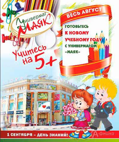 Весь август 2018 г. в белгородском универмаге «Маяк» акция «Учитесь на 5+» – к приближающемуся Дню знаний действуют скидки на школьный ассортимент.
