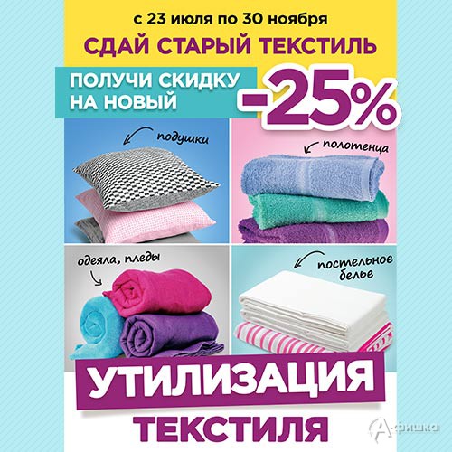 С 23 июля по 30 ноября 2018 г. в магазине товаров для дома «Посуда Центр» проходит утилизация текстиля – приносите свой старый текстиль и получите скидку 25% на новый!