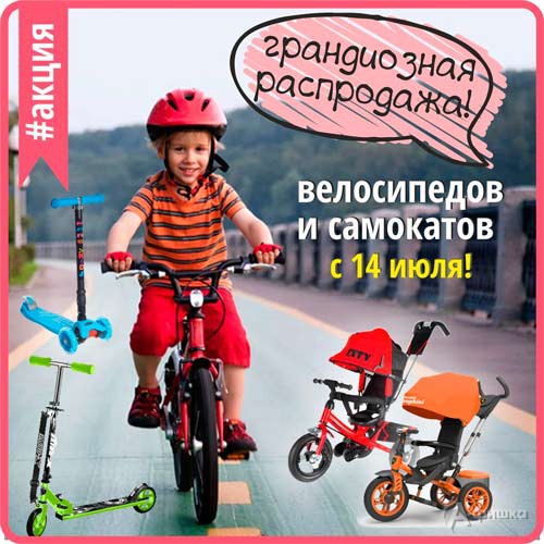 В магазине детских товаров «Карапузик» грандиозная распродажа – с 14 июля 2018 г. скидки на двухколёсные, трёхколёсные велосипеды и самокаты!