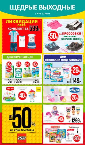 В супермаркетах детских товаров «Дочки-Сыночки» с 19 по 22 июля 2018 г. проходит акция «Щедрые выходные» – при покупке школьной обуви скидка 50% на кроссовки; скидки до 50% на конструкторы Lego.
