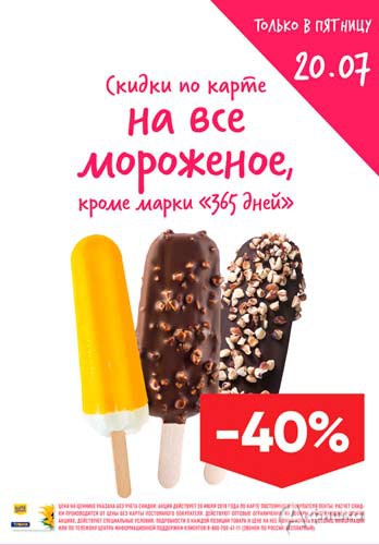 Только 20 июля 2018 г. в гипермаркетах «Лента» в Белгороде пройдет акция – скидка 40% на всё мороженое по карте «Лента»!