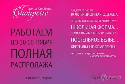 В бутике детской одежды «Choupette» в Белгороде в проходит акция – успейте обновить детский летний гардероб со скидками от 20 до 80%!