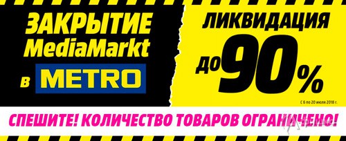 Ликвидация магазина бытовой техники и электроники «Media Markt» в ТЦ «Metro» – с 6 по 20 июля 2018 г. на все категории техники скидки до 90%!