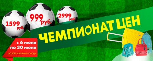 С 6 по 30 июня 2018 г. в магазинах «Империя сумок» проходит акция «Чемпионат цен» – ищите специальные ценники! На товары выгодные цены 999, 1599 и 2999 руб.!
