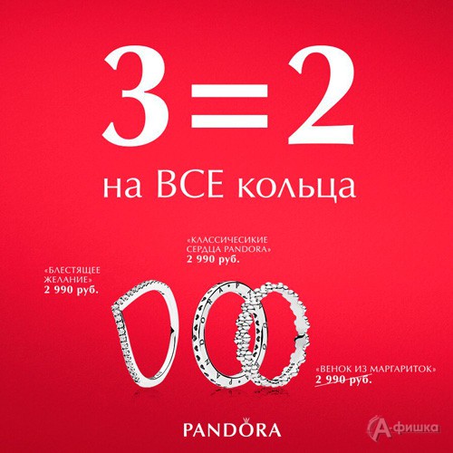 С 6 по 13 июня 2018 г. в ювелирных салонах «Pandora» проходит акция «3=2» на все кольца: купите два кольца и получите третье в подарок!