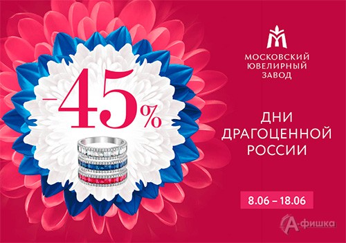 До 18 июня 2018 г. в магазинах «Московского ювелирного завода» проходит акция «Дни драгоценной России» – скидка 45% на украшения с драгоценными камнями из специального ассортимента!